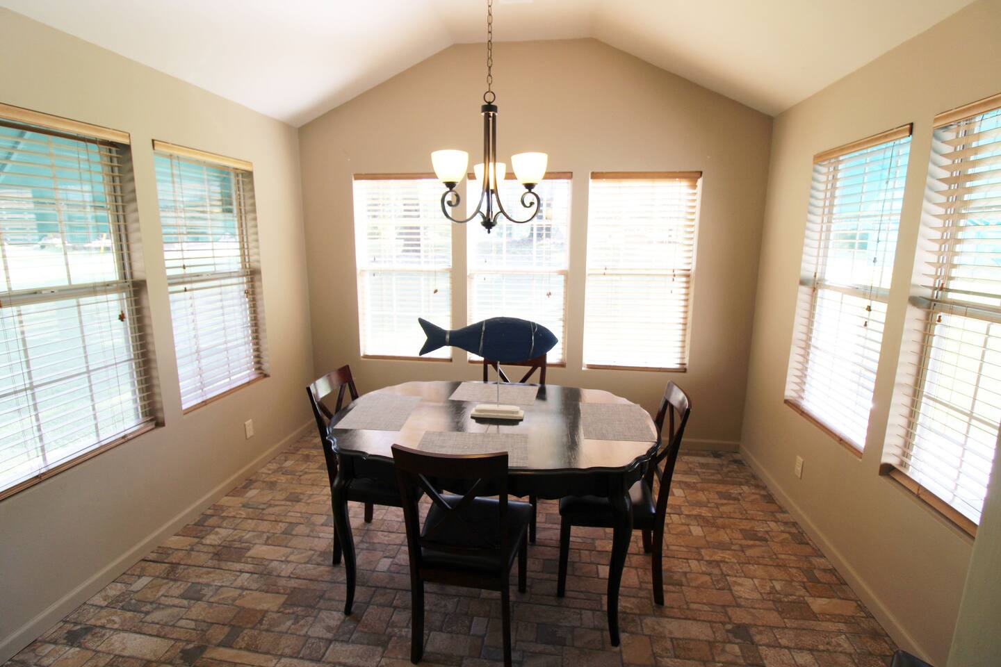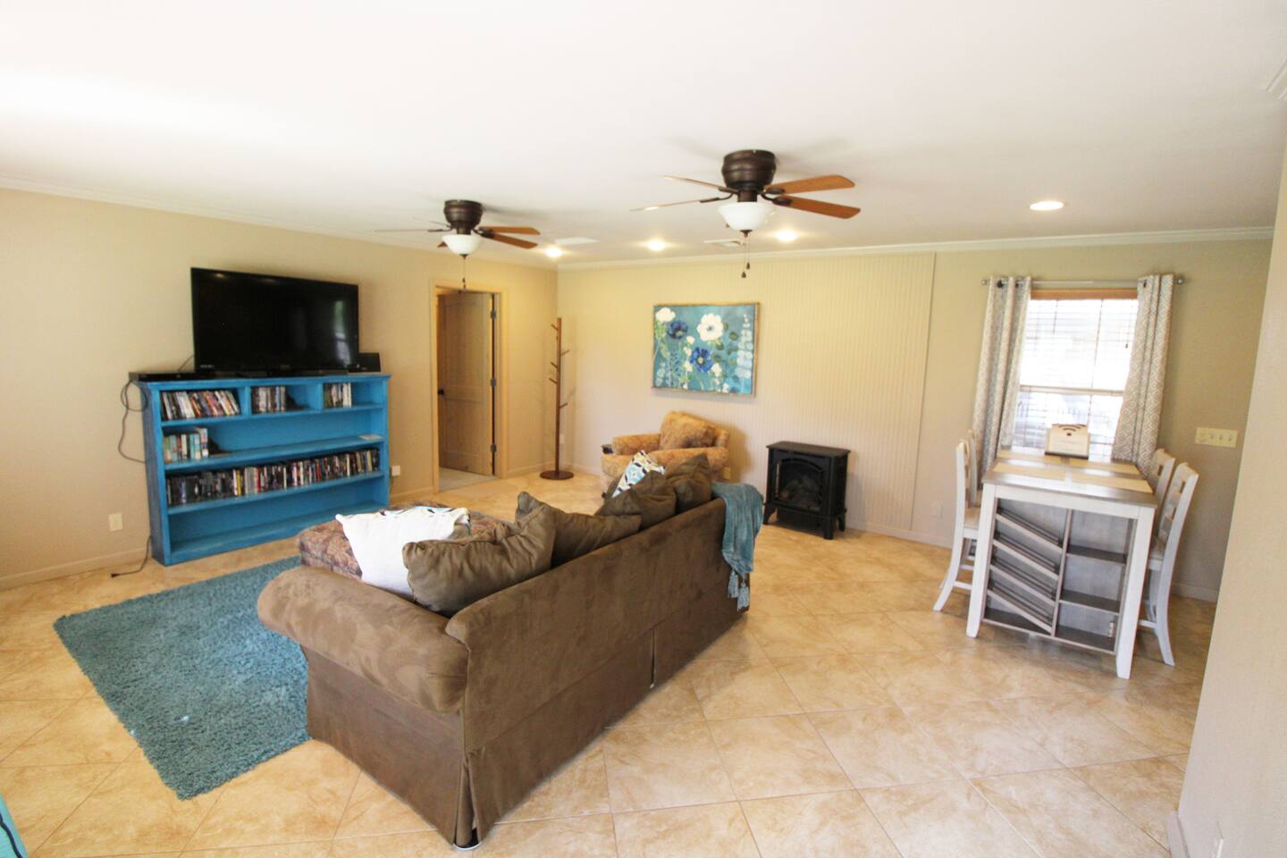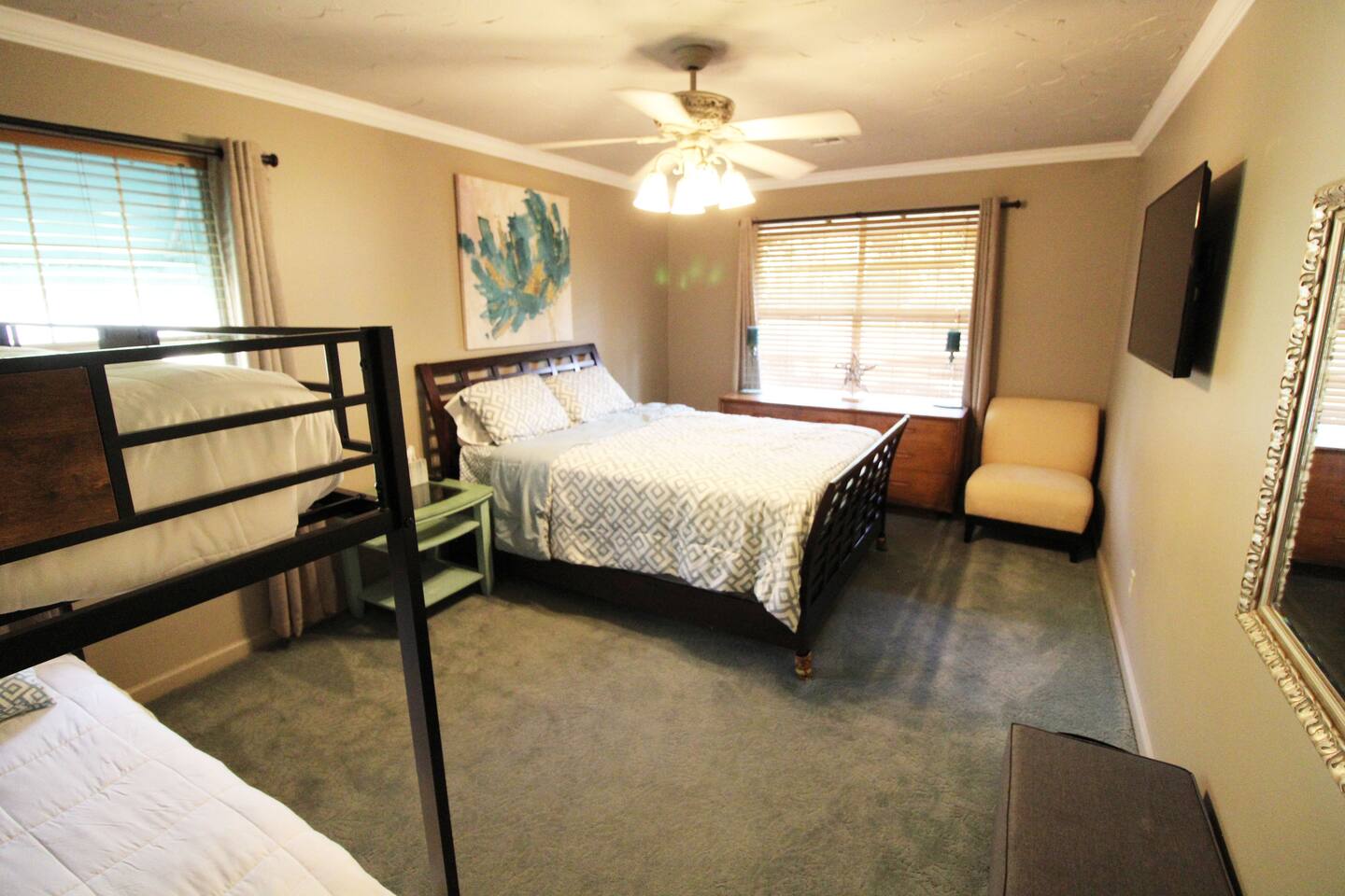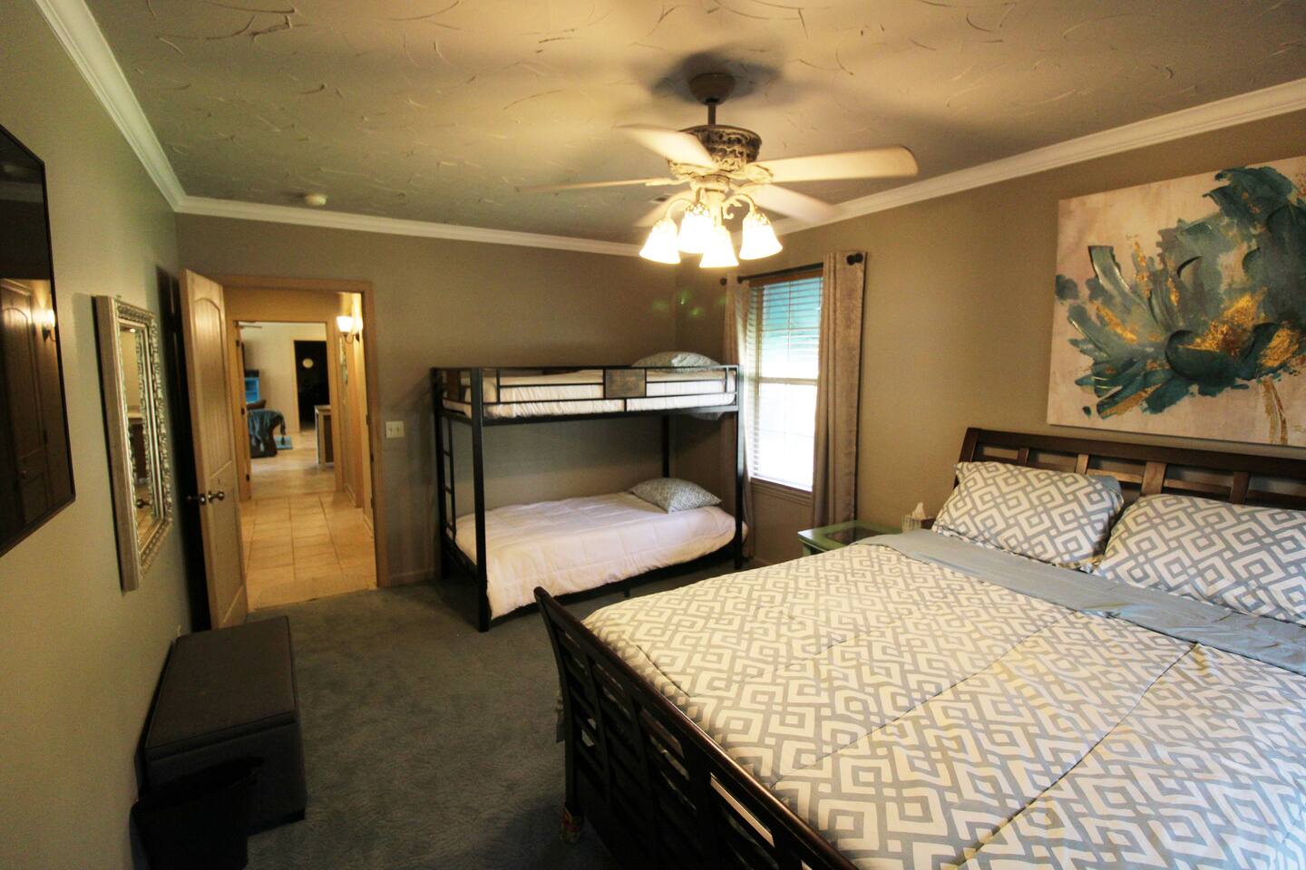 THIS HOME HAS 2 UNITS THAT CAN BE RENTED OUT TOGETHER IF BOTH AVAILABLE. THE LINK TO THE OTHER UNIT IS: http://airbnb.com/h/stowawaygrandlake ☆☆ HIGHLIGHTS ☆☆ ✹ 2 comfortable bedrooms + additional sleeping space ✹ 2 full bathrooms; essential toiletries provided ✹ Full kitchen w/ stainless steel appliances ✹ Spacious living room w/ flat-screen smart TV ✹ Second cozy living area for TV watching or reading by the windows ✹ High-speed WiFi ✹ Ample parking for multiple vehicles/boat trailer ✹ Access to the cove in the neighborhood ✹ Easy access to the lake, trails, groceries + local restaurants ✹ Furry friends welcome Eager to Read More? ★★ BEDROOMS ★★ After a long day on the lake, two spacious bedrooms with comfortable beds await, including bunk beds perfect for large families with kids. If you need additional sleeping space, there is a queen air mattress and a sleeping space on sofas that can accommodate more guests. ✹Primary Bedroom: Queen-sized bed, ensuite bathroom, with work desk/vanity ✹Bedroom 2: Queen-sized bed, and bunk beds ★★ BATHROOMS ★★ This spacious home boasts two full bathrooms (one connected to the primary bedroom and one off the hallway. Both bathrooms are sparkling clean, offering a relaxing space for freshening up. ✹Bathroom 1: Private ensuite bathroom to the primary bedroom ✹Bathroom 2: Full bath off of the hallway ✔ Complimentary toiletries provided (including shampoo, conditioner, and body wash) ✔ Hair dryer ✔ Fresh towels ✔ Laundry room w/ plenty of space ★★ KITCHEN & DINING ★★ Cook delicious meals the whole family will love in the large, open kitchen. You’ll have no problem getting into chef mode thanks to the spacious countertops, modern appliances, and all the appliances at your disposal. ✔ Fully stocked kitchen w/ modern appliances ✔Coffee maker ✔ Basic cookware & dinnerware ✔ Oversized dining table w/ seating for 4 + island seating for 2 + another dining area for 4 ★★ LIVING ROOM ★★ The cozy yet spacious living room sets the stage for fun family movie nights with sofa, a large chair, and a smart TV, If you can’t agree on what to watch, head to the additional living room with a sofa, a large flat-screen smart TV, and seating nook between bookcases. ✔ 2 large living rooms w/ flat-screen smart TVs ★★ OUTDOOR SPACE ★★ The outdoor space is where this property really shines. Step outside and breathe in the fresh air from the patio. Lots of space to play. Walk or drive down to the cove to see the water. ✔ Patio with chairs ✔ Gas grill + outdoor dining area ✔ Large yard surrounded by nature - dogs welcome! ✔ Easy access to the lake ✔ Boat + jet ski rentals available ★★ ACTIVITIES/ATTRACTIONS ★★ This home is the perfect place for nature lovers, as you’ll be surrounded by it on all sides. A cove to Grand Lake sits in the neighborhood, the home is in a wooded area, and there are several trails a short hop away. No matter how you prefer to reconnect with nature, here are a few of the best activities and attractions in the nearby area: ✔ Grand Lake O' the Cherokees: Embark on water adventures at Grand Lake, offering boating, fishing, and lakeside relaxation, ensuring a refreshing and scenic escape for vacationers. ✔ Pensacola Dam and Spillway: Explore the impressive Pensacola Dam, a scenic marvel on Grand Lake, providing vacationers with stunning views and the opportunity to stroll across the spillway, creating unforgettable memories. ✔ Little Blue State Park: Immerse yourself in nature at Little Blue State Park, a serene destination for hiking, picnicking, and wildlife observation, making it an ideal retreat for those seeking outdoor tranquility. ✔ Vinita Route 66 Festival: Plan your stay around the Vinita Route 66 Festival, a local event celebrating the iconic highway with food, music, and festivities, providing visitors with a taste of the community spirit. ✔ The Clanton's Cafe: Indulge in a classic Route 66 dining experience at The Clanton's Cafe, a historic eatery known for its delicious chicken fried steak and welcoming atmosphere. All these activities and more are within your reach when you book with us! ★☆ Book Today & Let Us Take Care Of You at Grand Lake ☆★
