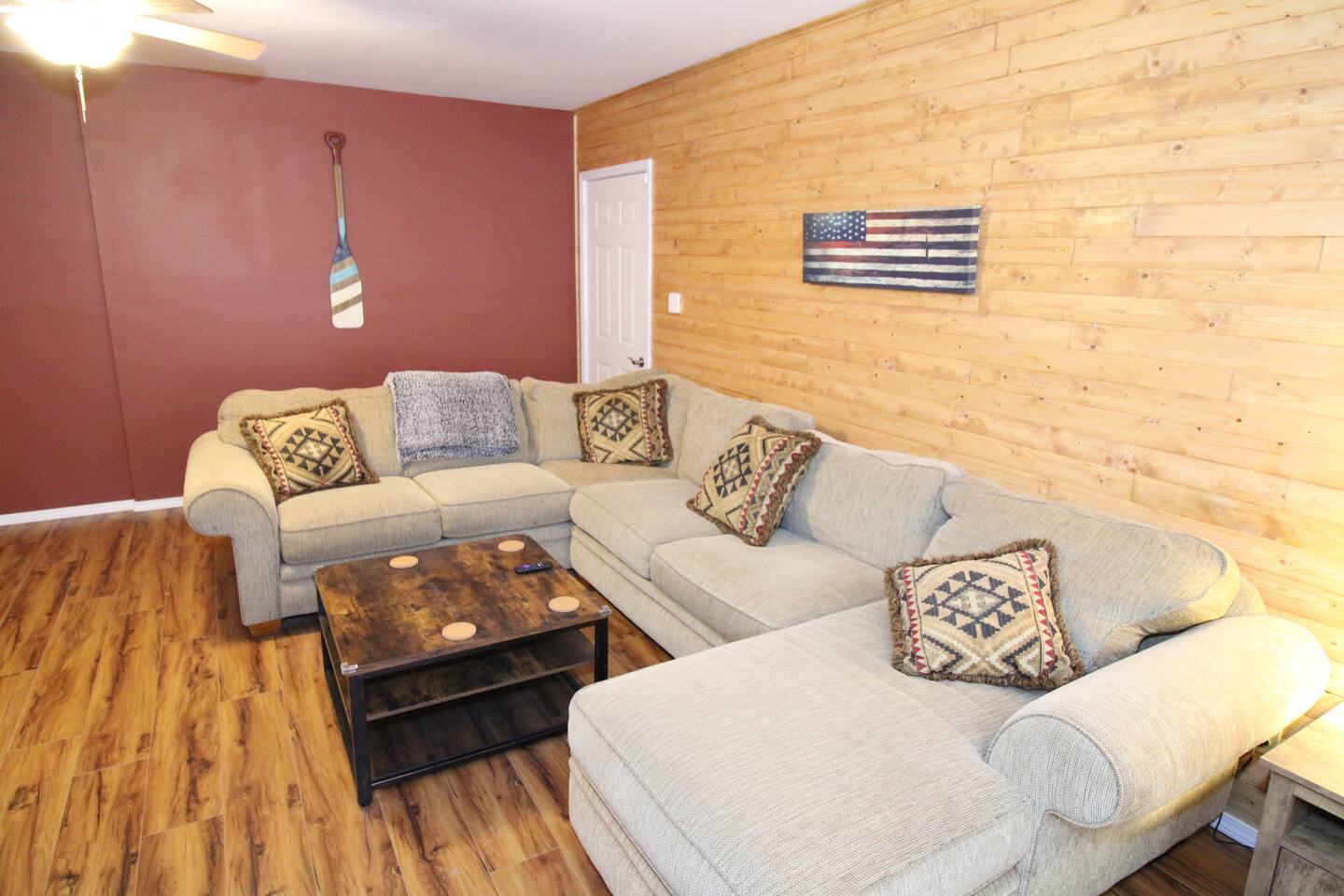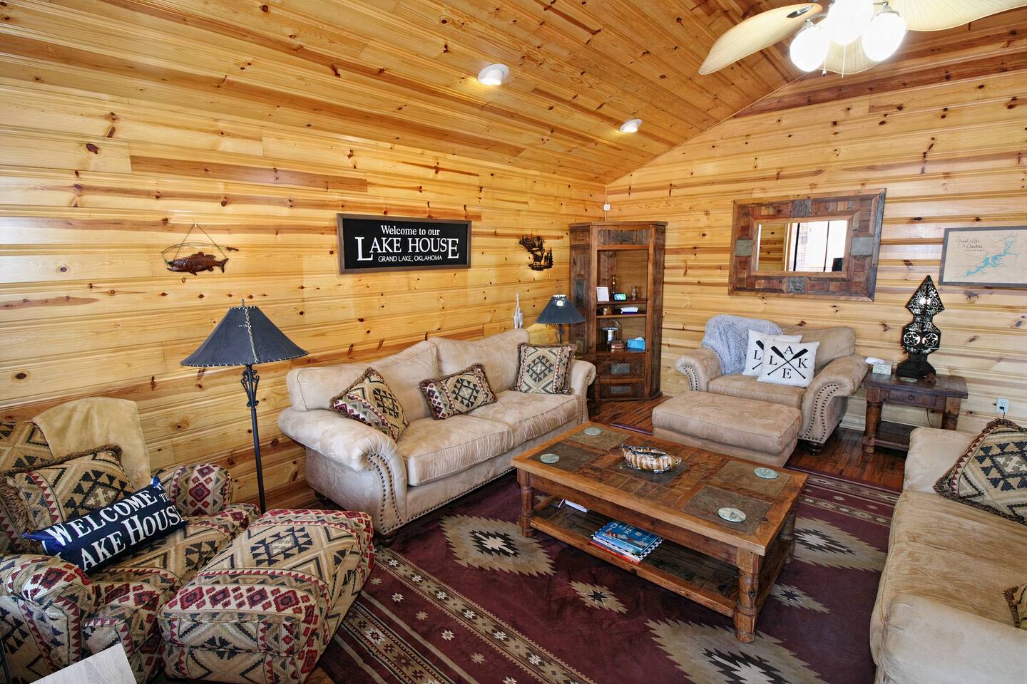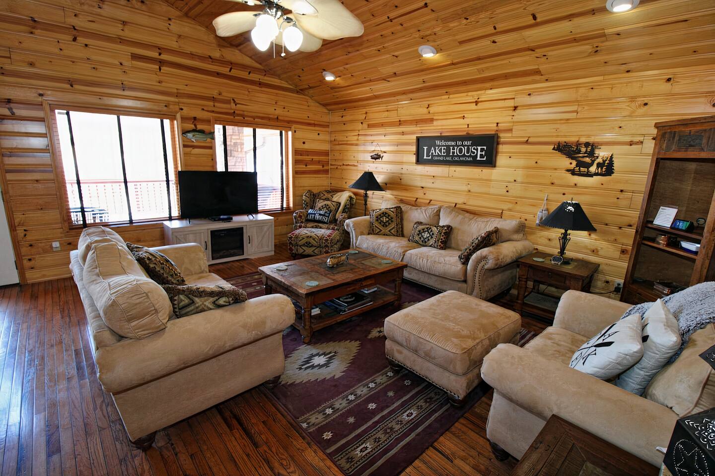 ☆☆ HIGHLIGHTS ☆☆ ✹ 3 comfortable bedrooms + additional sleeping space ✹ 2 full bathrooms + 1 half bath; essential toiletries provided ✹ Full kitchen w/ stainless steel appliances ✹ Complimentary coffee bar ✹ Spacious living room w/ flat-screen smart TV + Xbox ✹ Electric fireplace ✹ High-speed WiFi + dedicated workspaces in two bedrooms ✹ Private covered hot tub ✹ Large deck w/ lake views ✹ Serene outdoor space w/ secluded fire pit surrounded by woods ✹ Game room w/ ping pong + foosball ✹ 2 kayaks for guest use ✹ Ample parking for multiple vehicles/boat trailer ✹ Access to a private dock across the street ✹ Easy access to the lake, trails, groceries + local restaurants ✹ Furry friends welcome Eager to Read More? Here Are A Few Kind Words From Our Previous Guests: “Loved the place and was exactly as described. Wonderfully quiet with some really good fishing in the cove. Would definitely recommend this place to anyone! Ryan was super responsive to anything we asked as well!” - Daniel “Great location. Place was very clean. Highly recommend staying here!” - Anthony “probably my favorite spot I've ever stayed. peaceful, beautiful property tucked away and secluded. absolutely loved it and where I will stay every time I visit family from now on.” Rodney ★★ BEDROOMS ★★ After a long day on the lake, three spacious bedrooms with comfortable beds await, including a set of bunk beds perfect for large families with kids. If you need additional sleeping space, there is a queen air mattress and a large sectional sofa that can accommodate more guests. ✹Primary Bedroom: King-sized bed, ensuite bathroom, dedicated workspace w/ printer, flat-screen smart TV ✹Bedroom 2: Queen-sized bed, ensuite bathroom, flat-screen smart TV ✹Bedroom 3: Queen-sized bed, 2 twin-over-full bunk beds, 2 couches, dedicated workspace, direct access to the outdoor space ★★ BATHROOMS ★★ This spacious home boasts two full bathrooms (one connected to the primary bedroom and one shared by the second bedroom and main living space), plus an additional half bath. All three bathrooms are sparkling clean, offering a relaxing space for freshening up. ✹Bathroom 1: Private ensuite bathroom to the primary bedroom with a walk-in shower, dual sinks, and a walk-in closet ✹Bathroom 2: Ensuite to the second bedroom with a shower/tub combo, dual sinks, and a walk-in closet. Also accessible from the hallway. ✹Bathroom 3: Half bath ✔ Complimentary toiletries provided (including shampoo, conditioner, and body wash) ✔ Hair dryer ✔ Fresh towels ✔ Laundry room w/ plenty of counter space in the hallway ★★ KITCHEN & DINING ★★ Cook delicious meals the whole family will love in the large, open kitchen. You’ll have no problem getting into chef mode thanks to the spacious countertops, modern appliances, and all the appliances at your disposal. ✔ Fully stocked kitchen w/ modern appliances ✔ Complimentary coffee bar w/ Keurig machine & drip coffee maker ✔ Basic cookware & dinnerware ✔ Oversized dining table w/ seating for 6 + island seating for 4 ★★ LIVING ROOM ★★ The cozy yet spacious living room sets the stage for fun family movie nights with two sofas, a large chair, a smart TV, and an electric fireplace to keep you warm on chilly evenings. If you can’t agree on what to watch, head down to the lower level and you’ll find an additional living room with an expansive sectional sofa, a large flat-screen smart TV, and an Xbox Series S. ✔ 2 large living rooms w/ flat-screen smart TVs ✔ Electric fireplace ✔ Xbox Series S ★★ GAME ROOM ★★ Seeking some more entertainment options? You won’t have to go far! The garage has some fun games to keep the fun going. Challenge your group to a ping pong or foosball tournament, or enjoy a classic card game around the table. ✔ Garage space w/ fun games; ping pong + foosball ✔ 2 kayaks ✔ cahrcoal grill ✔ Work out area with weights, bench + pullup bar ★★ OUTDOOR SPACE ★★ The outdoor space is where this property really shines. Step outside and breathe in the fresh air from the large deck as you take in the stunning lake views, or enjoy some quality time with loved ones around the firepit after the sun goes down. Head across the street to the private dock to go for a paddle with the kayaks provided, or simply enjoy the views. ✔ Large patio w/ lake views, fire table, hammock + more ✔ Charcoal grill + outdoor dining area ✔ Private hot tub ✔ Secluded fire pit ✔ Large yard surrounded by nature - dogs welcome! ✔ Easy access to the lake + private dock for fishing or boating ✔ 2 kayaks available for free use ✔ Boat + jet ski rentals available ★★ ACTIVITIES/ATTRACTIONS ★★ This home is the perfect place for nature lovers, as you’ll be surrounded by it on all sides. A cove to Grand Lake sits just across the street, the home is encircled by forest, and there are several trails a short hop away. No matter how you prefer to reconnect with nature, here are a few of the best activities and attractions in the nearby area: ✔ Grand Lake O' the Cherokees: Embark on water adventures at Grand Lake, offering boating, fishing, and lakeside relaxation, ensuring a refreshing and scenic escape for vacationers. ✔ Pensacola Dam and Spillway: Explore the impressive Pensacola Dam, a scenic marvel on Grand Lake, providing vacationers with stunning views and the opportunity to stroll across the spillway, creating unforgettable memories. ✔ Little Blue State Park: Immerse yourself in nature at Little Blue State Park, a serene destination for hiking, picnicking, and wildlife observation, making it an ideal retreat for those seeking outdoor tranquility. ✔ Vinita Route 66 Festival: Plan your stay around the Vinita Route 66 Festival, a local event celebrating the iconic highway with food, music, and festivities, providing visitors with a taste of the community spirit. ✔ The Clanton's Cafe: In