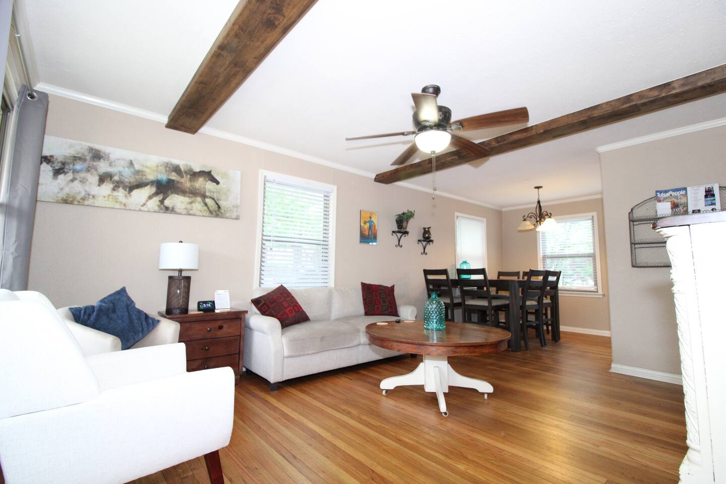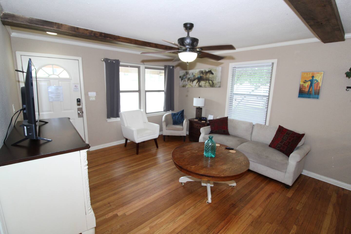 Dog friendly with privacy fenced yard and no pet fee. No check out chores. Right across the street from the Expo Center Gate 6. Easy walking access to barns for horse shows. This fully furnished, 3-bedroom home is close to shopping and dining. The home is complete with a well-stocked kitchen, a spacious living room, a super clean bathroom, and a fenced backyard. Enjoy fast WiFi, Amazon Alexa, video games, and more Create Lasting Memories In Tulsa With Us & Learn More Below!